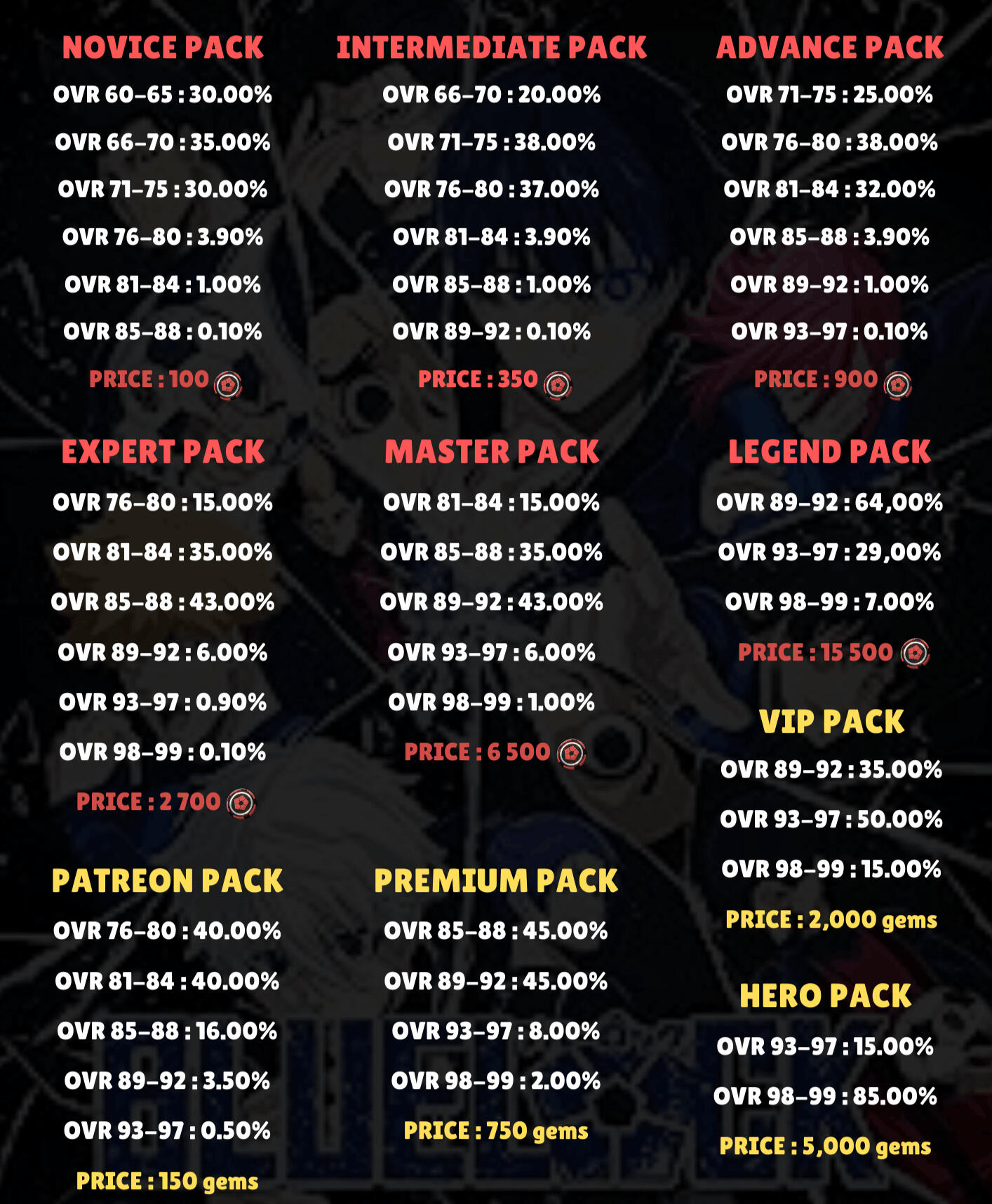 | 2nd Division | 65 USD or 500.000 Red Coins or 30.000 gems | 4 Hero packs, 8 VIP packs, 12 Legend packs |